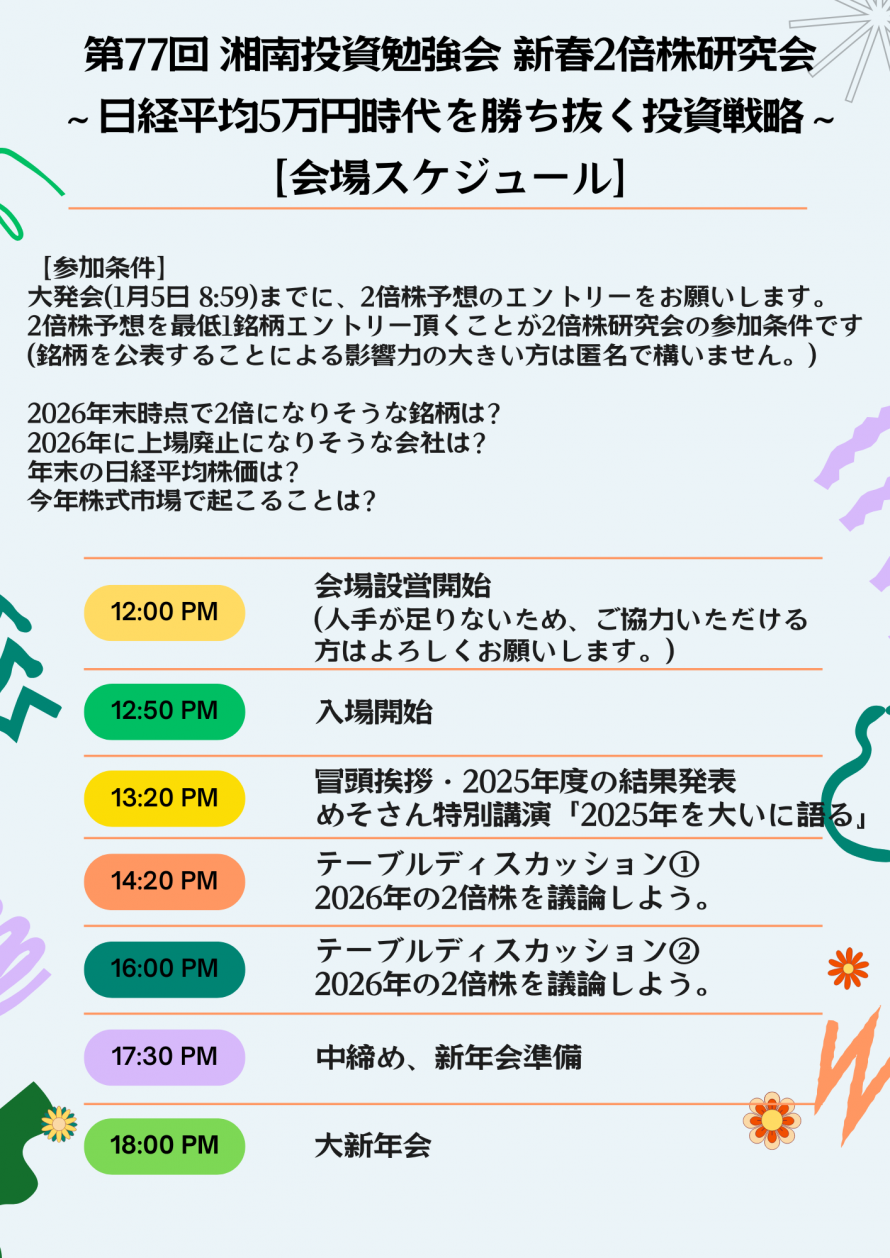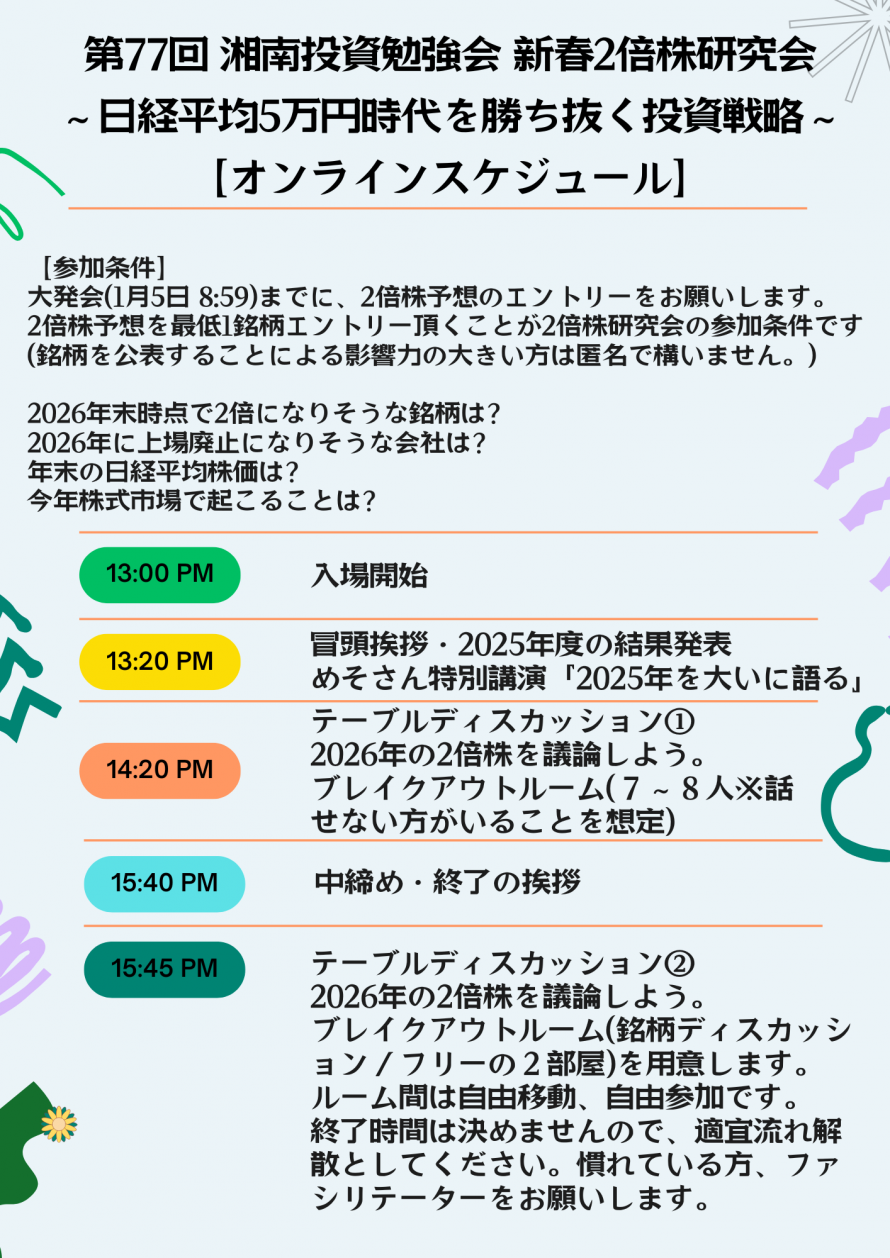2026年の大発会(2026年1月5日 8:59 AM)までに、2倍株予想のエントリーをお願いします。